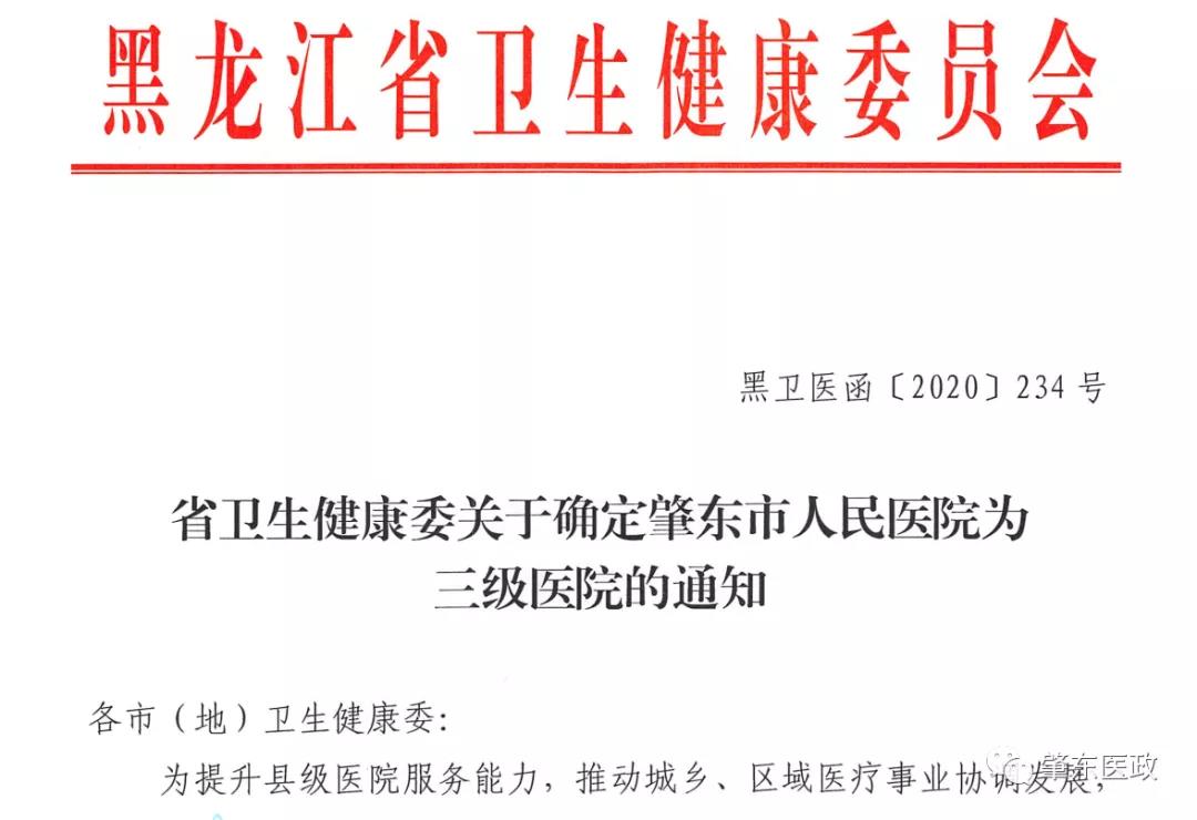 2020年12月14日,黑龍江省衛健委下發了《省衛生健康委關于確定肇東市人民醫院為三級醫院的通知》(黑衛醫函【2020】234號),正式批準肇東市人民醫院成為三級綜合醫院。