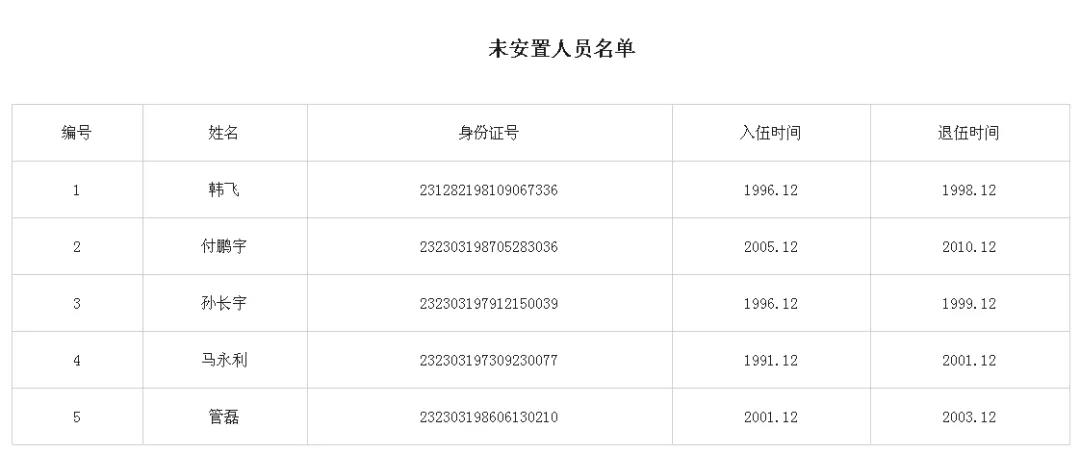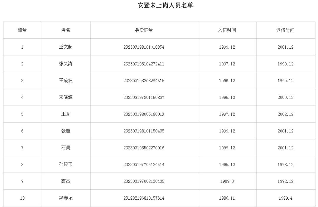 以上人員請于2020年12月31日前,持本人身份證、退伍證原件、檔案由本人保管的提供原件,到肇東市退役軍人事務局二樓移交安置股辦理安置上崗相關(guān)手續(xù),在規(guī)定時間未報到的按自動放棄處理。