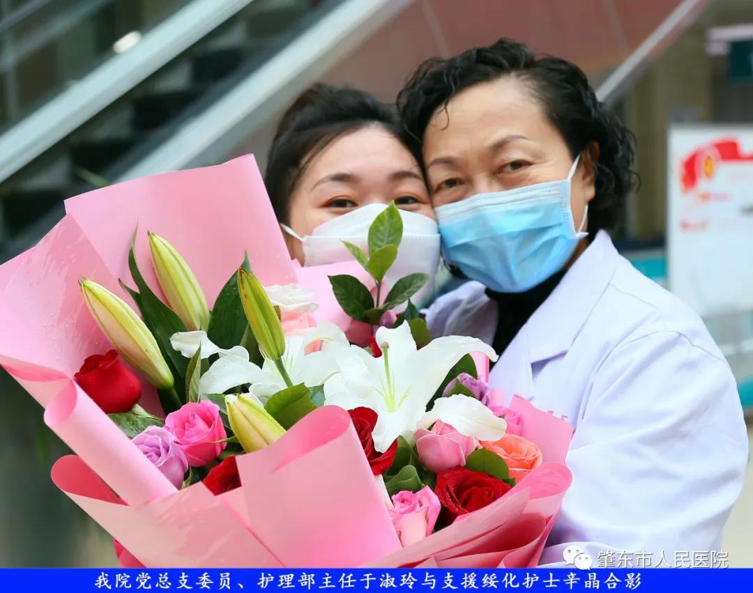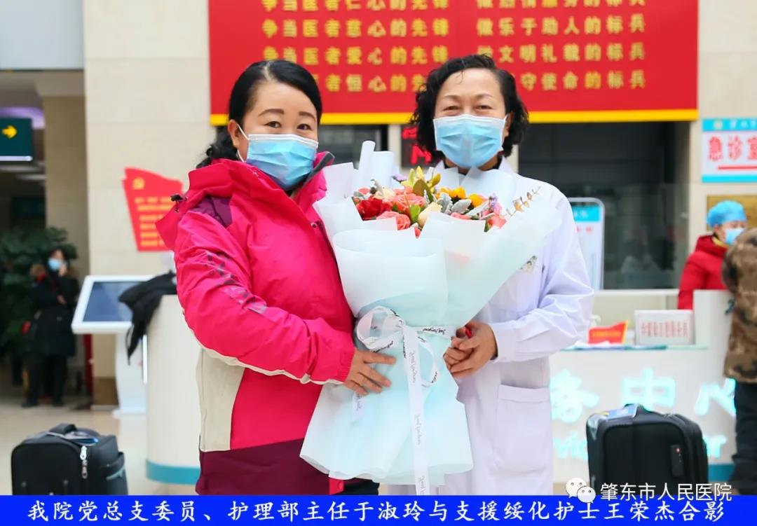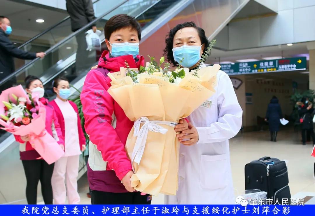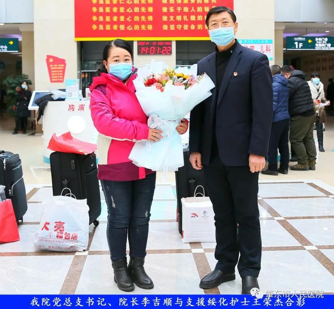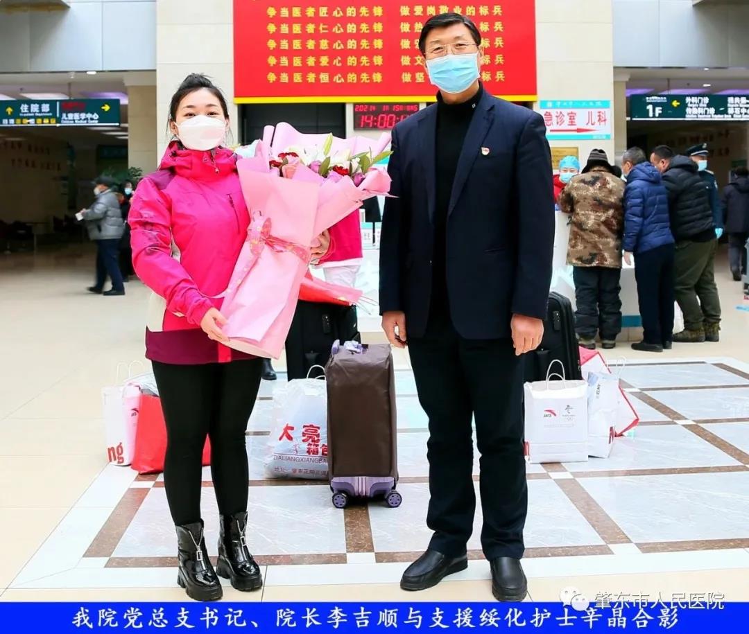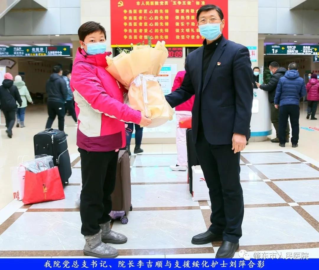 此次趕赴綏化,是我院繼趙志剛、溫明馳援湖北,欒宏偉、趙虹琪、劉文宇支援綏化后的再次出征。出發前,我院在門診大廳舉行了短暫而又莊重的歡送儀式。沒有太多的祝福和掌聲,一切都太過匆匆,大家都太過忙碌,全院醫務工作者都各自奮戰在如火如荼的全民抗疫工作當中,人民醫院黨總支書記、院長李吉順,黨總支委員、護理部主任于淑玲代表全院職工向三名護理工作者送去鮮花和祝福,希望她們此次出征能夠不負使命、不負重托,充分發揚崇高的職業精神,在工作當中服從指揮、服從大局,忠于職守、相互配合,同時也要注意防寒保暖,做好個人防護。并祝愿她們能夠光榮出征,平安履職,勝利凱旋。
