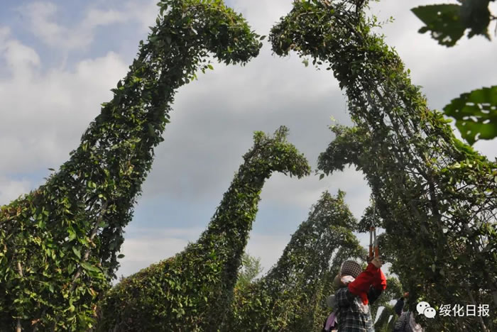 七月,肇東市五站鎮曲鄉村的浩晨園林綠化工程有限公司苗木基內,長頸鹿、大象、蘑菇等形態各異的造型樹一字排開。