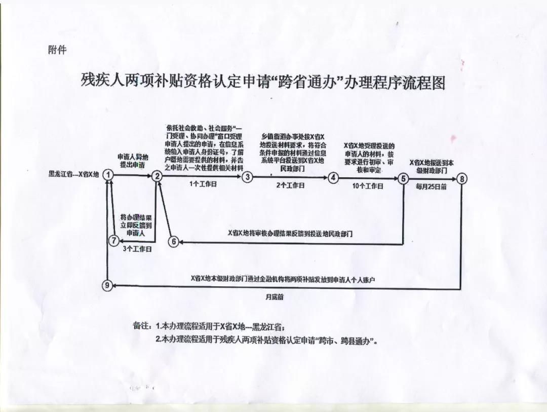 二、規(guī)范補貼資格認定申請“跨省通辦”程序各鄉(xiāng)(鎮(zhèn))、街道辦事處要按照異地代收代辦方式,統(tǒng)一使用全國殘疾人兩項補貼信息系統(tǒng)(以下簡稱全國系統(tǒng))受理殘疾人兩項補貼資格認定“跨省通辦”申請。受理地要一次性告知申請人所需要提供的材料,及時將相關(guān)證明材料等申請信息錄入全國系統(tǒng),并在申請材料收齊之日起3個工作日內(nèi)推送至業(yè)務(wù)屬地(即申請人戶籍所在地)的補貼受理窗口;業(yè)務(wù)屬地為申請人遠程辦理,自收到推送材料之日起10個工作日內(nèi)完成補貼資格認定,辦理結(jié)果將由全國系統(tǒng)實時反饋受理地;受理地應(yīng)在收到辦理結(jié)果3個工作日內(nèi),將辦理結(jié)果以適當(dāng)方式通知申請人。享受補貼政策的類型及標(biāo)準(zhǔn)由業(yè)務(wù)屬地負責(zé)解釋。補貼資格審定合格的,自遞交申請當(dāng)月由業(yè)務(wù)屬地計發(fā)補貼。