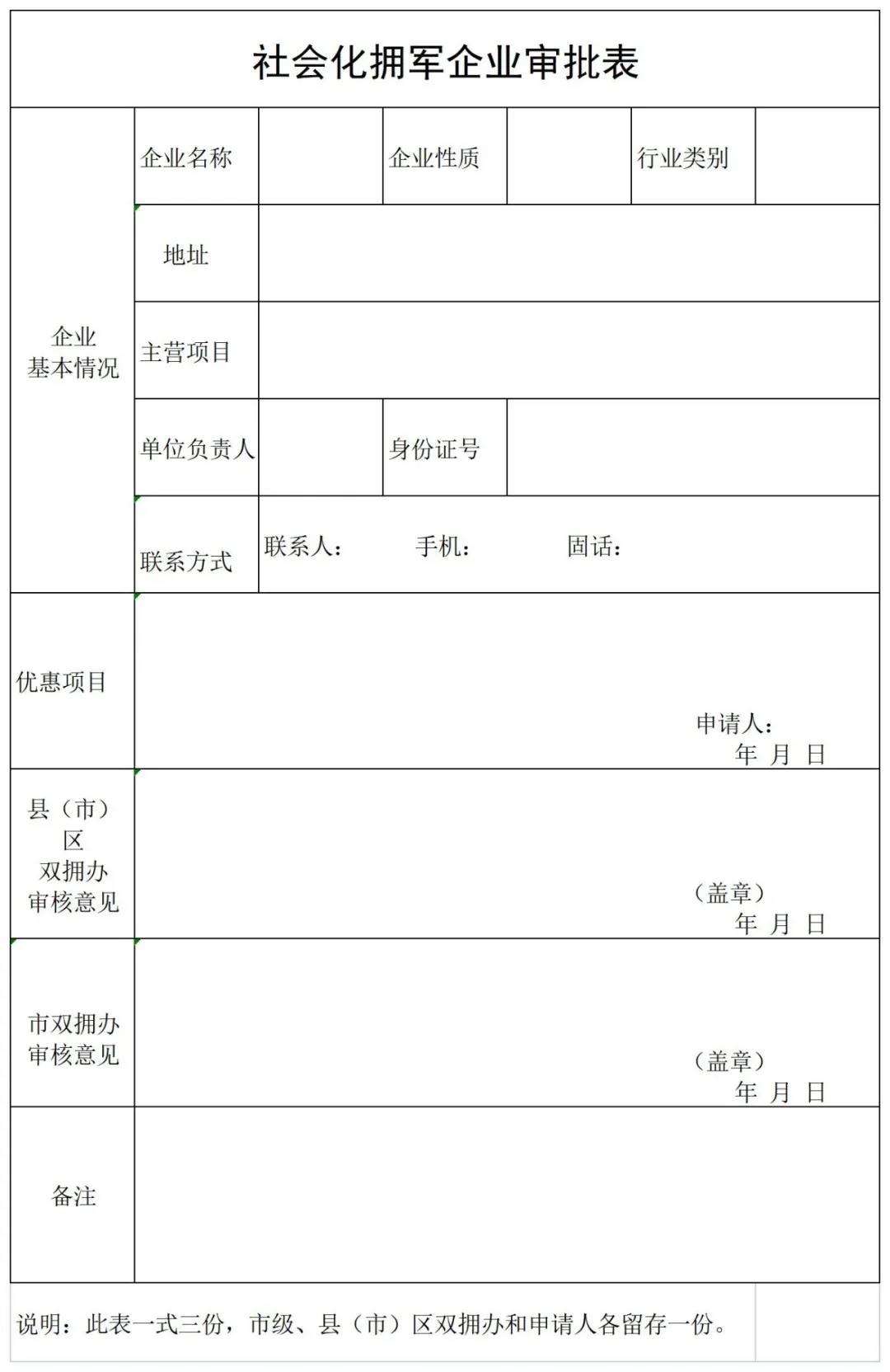 有報(bào)名意愿的企業(yè)和社會(huì)組織,可持統(tǒng)一社會(huì)信用代碼(副本)、法人身份證原件和復(fù)印件、《社會(huì)化擁軍企業(yè)(社會(huì)組織)審批表》到肇東市雙擁辦報(bào)名。