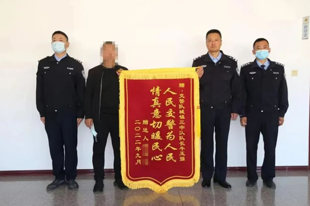 9月中旬,肇東市七道街利民城附近人行道違停三輛翻斗車嚴(yán)重影響行人通行,造成一周姓老年人因躲避車輛而摔倒,如果不及時處理可能造成其它嚴(yán)重后果。城鎮(zhèn)三中隊得知情況后立即趕到現(xiàn)場,根據(jù)具體情況將三輛車托運(yùn)至停車場,消除了安全隱患,得到周邊群眾一片叫好聲。9月25日,被摔倒老人的兒子為感謝交警,送來一面寫有“人民交警為人民 情真意切暖民心”的錦旗表示感謝!