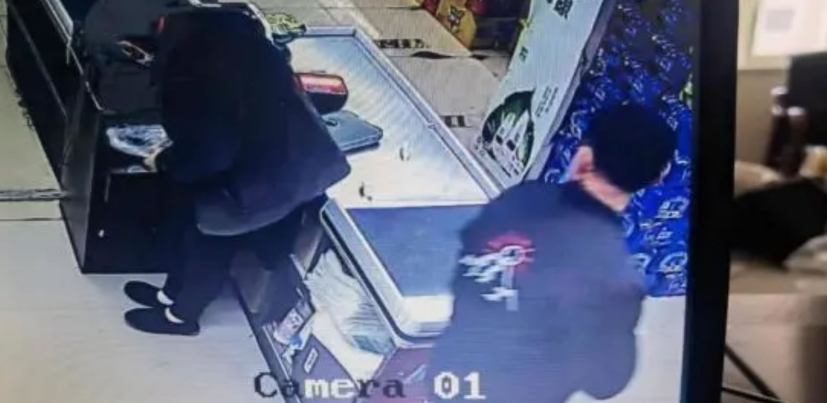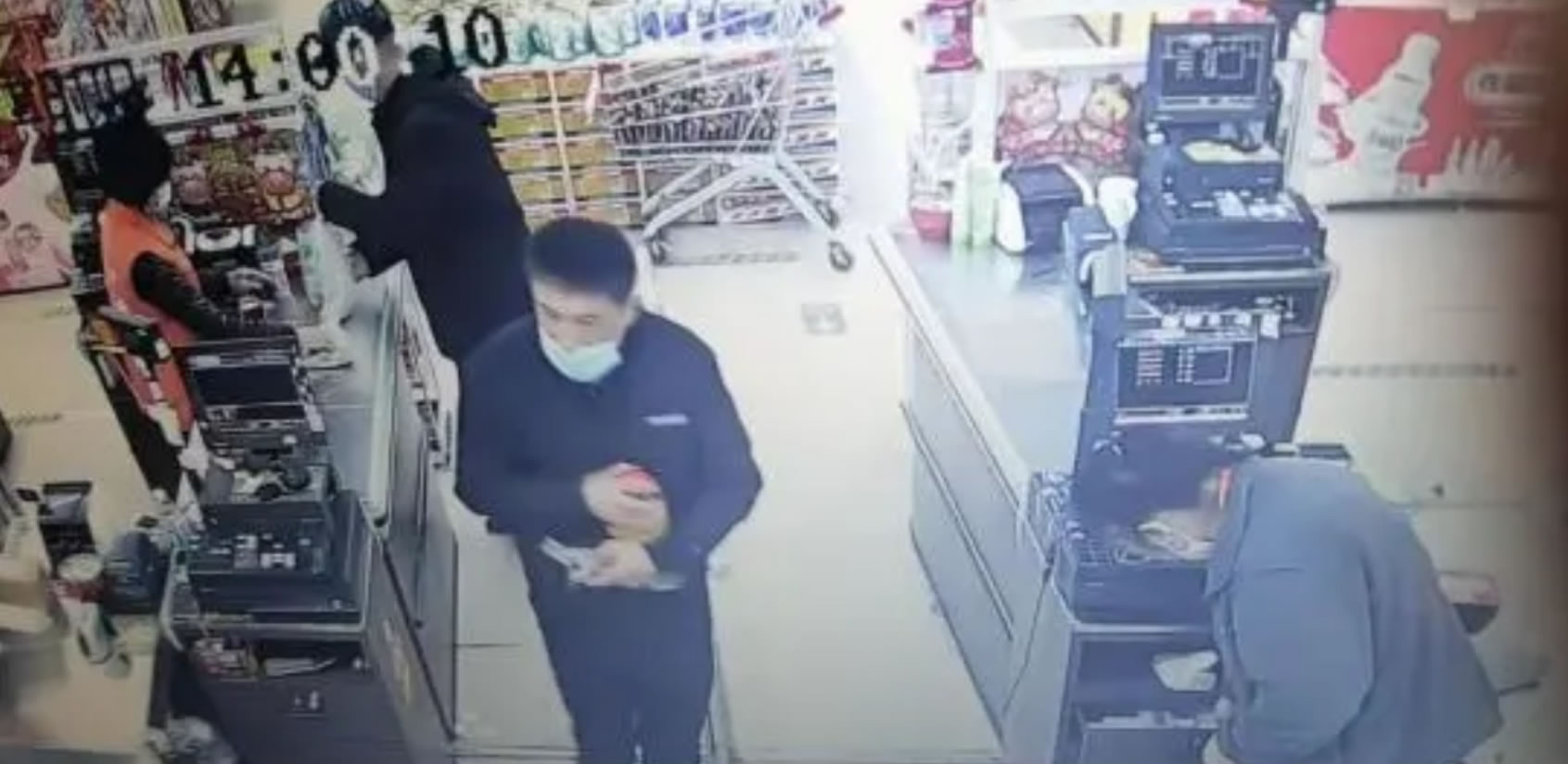 1 、2022年11月3日13時59分,在十七道街佳碩超市購物結賬的男子,上身黑色棉服,背部有紅白圖案、黑色褲子,戴藍色口罩。