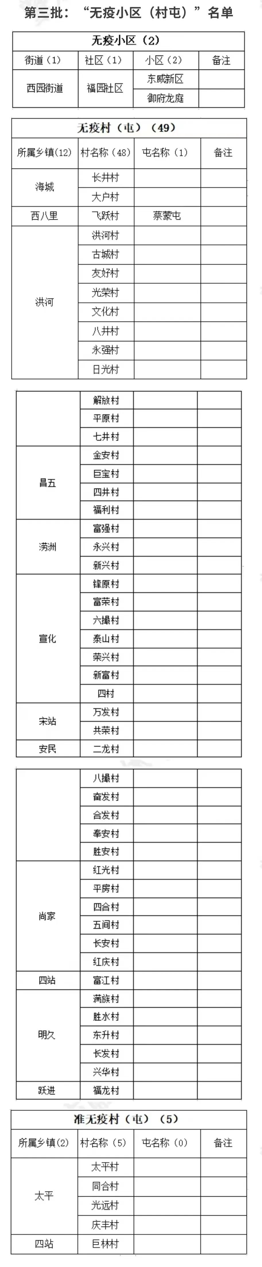根據《肇東市“無疫小區(村屯)”創建工作方案(試行)》,經肇東市各社區(村)申報、街道(鄉鎮)審核,市專家組審定,第三批確定2個小區為“無疫小區”、49個“無疫村(屯)”、5個“準無疫村(屯)”。