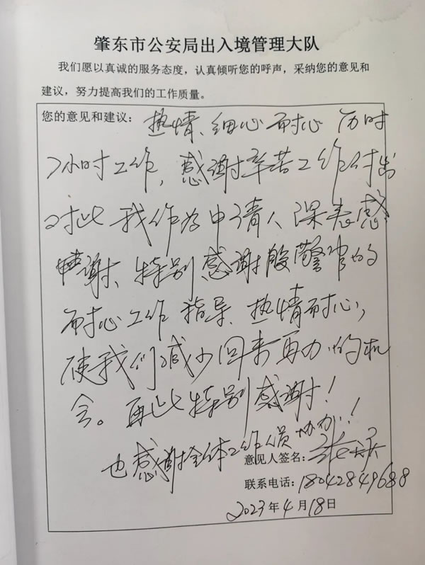 4月18日,從香港返鄉的肇東籍居民張先生攜妻子陳女士來到肇東市公安局出入境接待大廳,妻子陳女士是香港人,兩人此次是專程飛回來辦理張先生赴香港定居手續,為了不耽誤二人的返程時間,辦證民警加班加點忙碌兩個多小時為張先生辦理通過所需辦證材料,張先生感動不已,連連說:“家鄉人太好了,你們出入境民警太暖心了!”當即寫下一封感謝信表達心情。