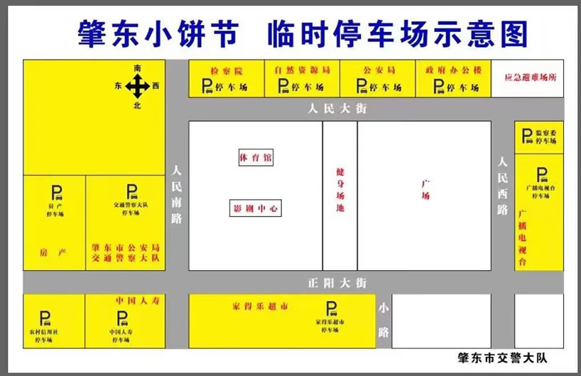 開放停車場11處:檢察院(可停車80輛)、自然資源局(可停車60輛)、公安局(可停車80輛)、黨政中心(可停車150輛)、廣電中心(可停車15輛)、監察委(可停車40輛)、交警隊(南院可停車40輛,北院可停車20輛)、房產處(可停車30輛)、農村信用社(東院可停車30輛、西院可停車30輛)、人壽保險公司院內停車場(可停車20輛),家得樂超市步道板上停車位(可停車20輛)。請各位駕駛員按照現場交警及工作人員指引有序停放車輛。