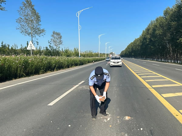 9月2日15時,肇東鎮派出所在轄區環南環路八道街至五岔路口巡邏時發現路面有過往運輸殘土車輛遺落的混凝土磚塊等殘土,存在嚴重道路交通隱患, 容易引發道路交通事故,嚴重影響過往車輛正常通行和駕駛人員安全。派出所巡邏民輔警第一時間設立交通反光錐,緩行指示牌,在提醒過往車輛注意行車安全減速慢行的同時,及時清理遺落的殘土,確保道路行車安全,受到過往群眾一致好評。