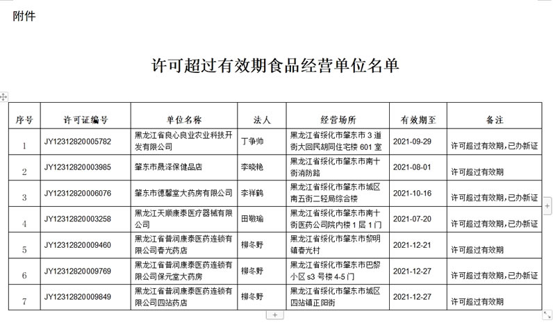 根據“黑龍江省市場監督管理局綜合業務管理系統”反饋,我市現有7家食品經營許可證已超過有效期的食品經營單位。根據《食品經營許可和備案管理辦法》第五章第三十九條 有下列情形之一,原發證的市場監督管理部門應當依法辦理食品經營許可注銷手續:(一)食品經營許可有效期屆滿未申請延續規定,現對其注銷,現予以公告。