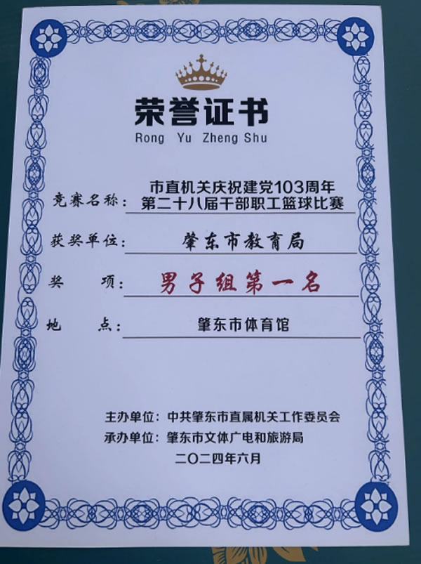 在6月15日-22日我市市直機關工委舉辦的“慶祝中國共產黨成立103周年第二十八屆干部職工籃球比賽”中,教育局代表隊一路過關斬將,獲得市直男子組第一名的佳績。