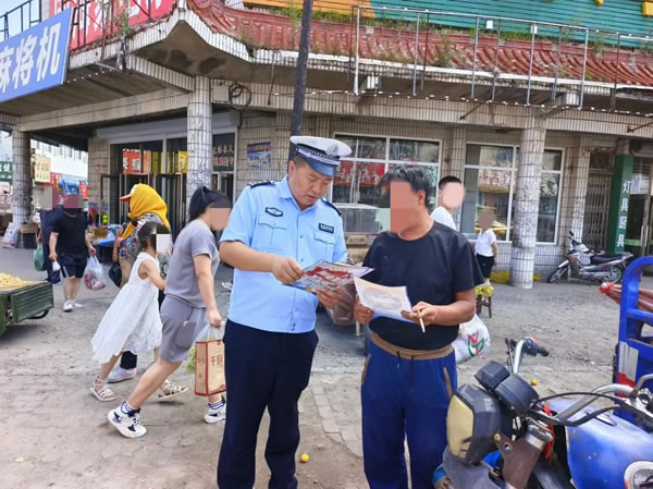 在昌五鎮中心商業區,這里聚集了周邊鄉鎮眾多村屯群眾在此購物、游玩,人流、車流不息。宣傳民警深入到集市、商場等人員密集區域,結合當前交通安全宣傳工作重點活動實際,通過大篷車巡回宣講、懸掛宣傳條幅、發放交通安全宣傳資料等多種宣傳方式,與群眾面對面溝通,、解答群眾關于交通法律法規方面的疑問,向廣大農民群眾宣傳“一盔一帶”的重要性和農用車違法載人、客貨混載、三超一疲勞、無牌無證、酒后駕駛等交通違法行為的危害性。宣傳講解《黑龍江省電動車管理條例》相關內容,教育引導農民群眾要遵守交通安全法律法規,提高交通安全意識,自覺抵制各類交通違法行為。爭做文明出行的踐行人和傳播者。