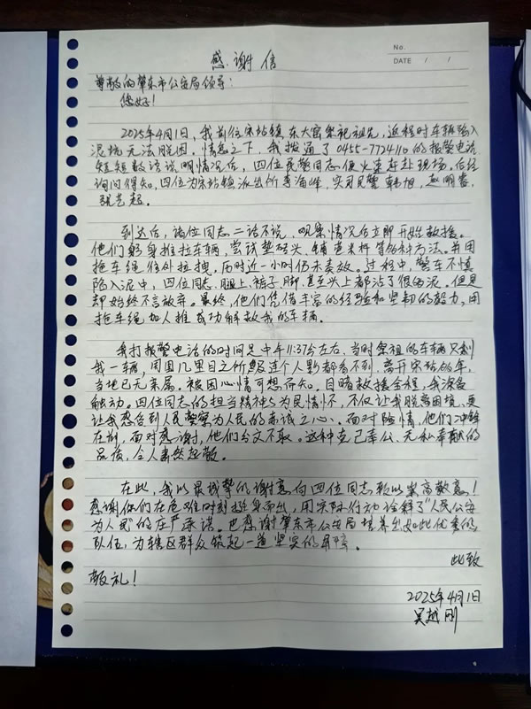 近日,肇東市公安局宋站派出所民警用實際行動書寫了為民服務的暖心篇章。民警張臨帶領新警張藝超、韓旭、趙明睿,成功幫助一名外地司機吳先生將陷在泥地里的轎車拖拽出來,讓司機在困境中感受到了人民警察的關懷與擔當,4月7日,群眾吳先生親自到肇東市公安局為“春苗”民警和宋站派出所民輔警送來感謝信。