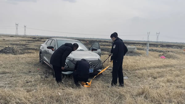 事發當日,宋站派出所接到一位外地司機的緊急求助電話。電話中,司機聲音焦急,稱自己對當地路況不熟悉,車輛不慎陷入野地,無法動彈,周圍荒無人煙,自己孤立無援。接警后,民警張臨深知情況緊急,立即帶領新警張藝超、韓旭、趙明睿,攜帶救援工具迅速趕赴現場。