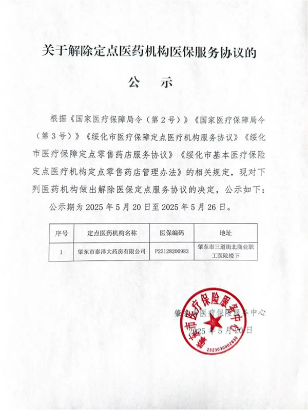 關于解除定點醫療保險醫保服務協議的公示