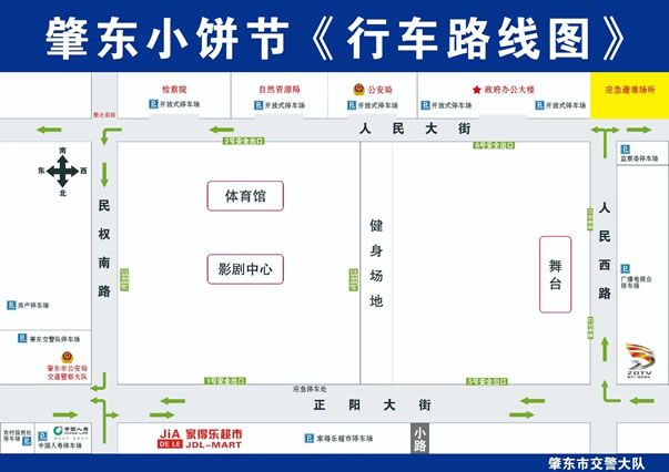 參加美食文化節的車輛,由正陽街與人民西路交叉路口向南,轉至人民大街,按照現場交警指揮分別到市黨政中心、市檢察院、市國土資源局、市公安局院內停車場有序停放,不進入停車場的車輛,經檢察院路口直行或左轉離開,禁止在路邊黃道牙處和路中停車。
