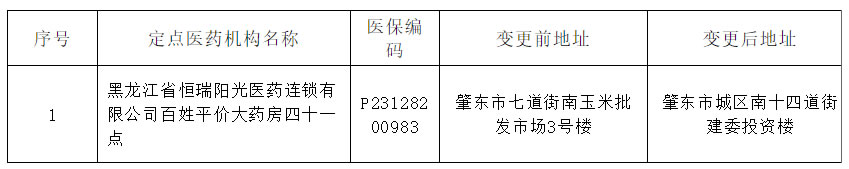 根據《國家醫療保障局令(第2號)》《國家醫療保障局令(第3號)》《綏化市醫療保障定點醫療機構服務協議》《綏化市醫療保障定點零售藥店服務協議》《綏化市基本醫療保險定點醫療機構定點零售藥店管理辦法》的相關規定,現對變更定點零售藥店地址公示如下: