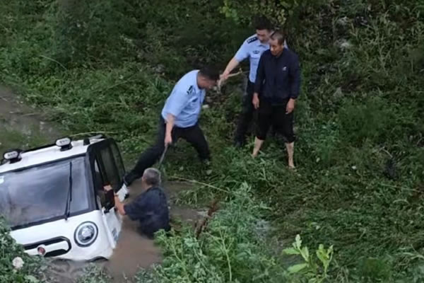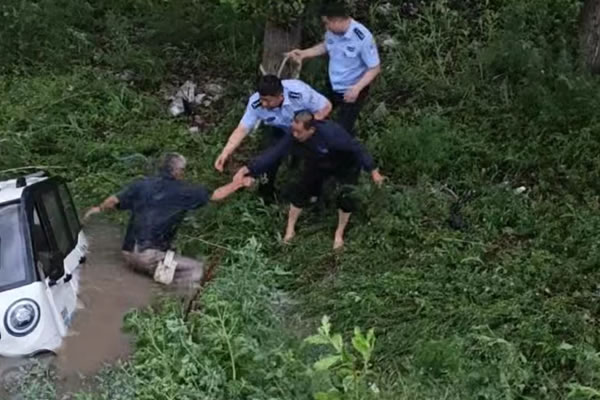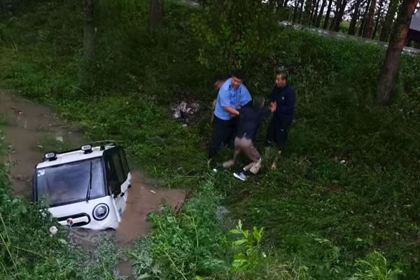 8月2日晚七時許,狂風大雨襲擊了肇東市昌五鎮(zhèn),路面和公路兩側的坑內積水瞬間上漲。此時,從肇東方向駕駛電車回躍進鄉(xiāng)的六旬老人劉某,因大雨遮擋視線,再加上路面積水過深,操作失誤將車輛開進了S311省道昌五鎮(zhèn)境內的大坑內側翻,駕駛員被車輛困在坑內齊腰積水中,無法脫身。路過的群眾發(fā)現(xiàn)后立刻報警,昌五派出所民輔警接警后趕到現(xiàn)場。