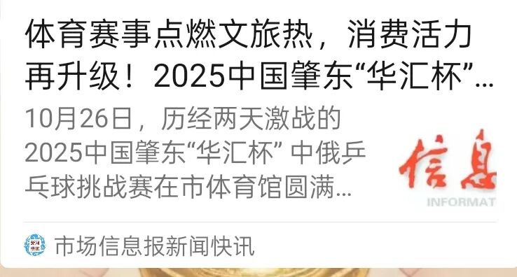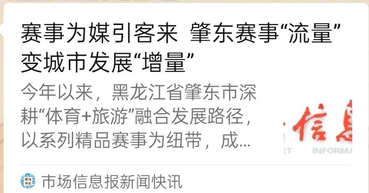 近日,肇東市以系列精品賽事為核心的文體旅融合發展模式引發多家媒體集中關注,今日頭條、騰訊新聞、搜狐新聞、百度、市場信息報信息快訊等多家媒體相繼聚焦其賽事經濟成效進行專題報道,讓肇東“以賽促游、以游興城”的發展故事成為矚目焦點,賽事經濟成為城市的新名片。