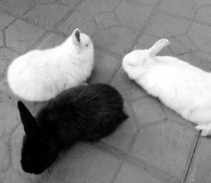 去年3月份蔡先生買回來5只小家兔,平時除了喂食白菜、蘿卜,工人吃剩的飯菜不論葷素都會倒進兔子食盆。去年冬天一只母兔懷孕,不久前產下3只幼崽,竟然全部只有一只右耳。