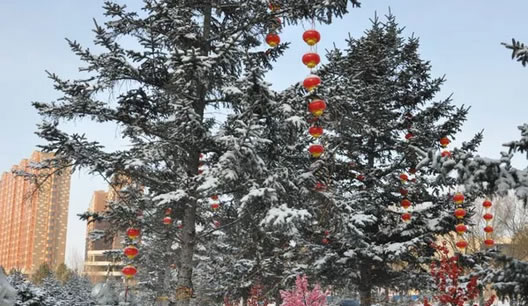 3月1日,肇東市喜迎元宵佳節瑞雪,城區公園、廣場、街道、樓房等建筑物銀裝素裹,掩映著高高掛起的大紅燈籠。