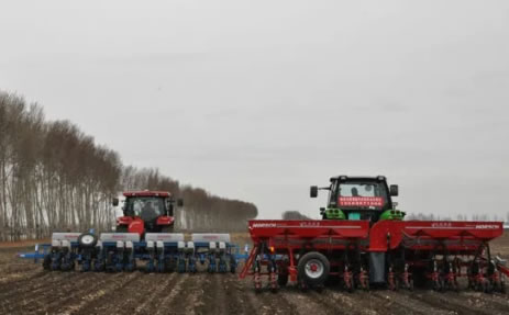 5月2日,肇東市海城鄉雙麗現代農機專業合作社的12行氣吸式精量播種機,正在長興村玉米大壟雙行地塊進行種肥同播分施作業,畝播種密度4500株,預計畝增產100公斤。