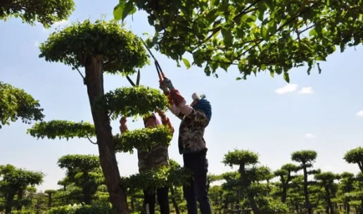 5月20日,肇東市農(nóng)戶正在蘇萌園林產(chǎn)業(yè)扶貧基地為成品造型樹進(jìn)行修枝整形。
